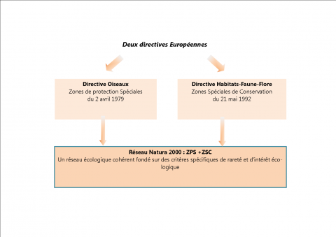 L’application de la Directive « Oiseaux » (1979) et « Habitats-Faune-Flore » (1992) a pour objectif le maintien ou le rétablissement dans un état de conservation favorable des habitats naturels ainsi que la flore et la faune sauvage d’intérêt communautaire. Il s’agit de promouvoir une gestion concertée et assumée avec tous les acteurs intervenant sur les espaces naturels la conservation de la diversité biologique. Celle-ci est souvent liée aux différentes actions humaines, spécialement dans les milieux forestiers et ruraux.
